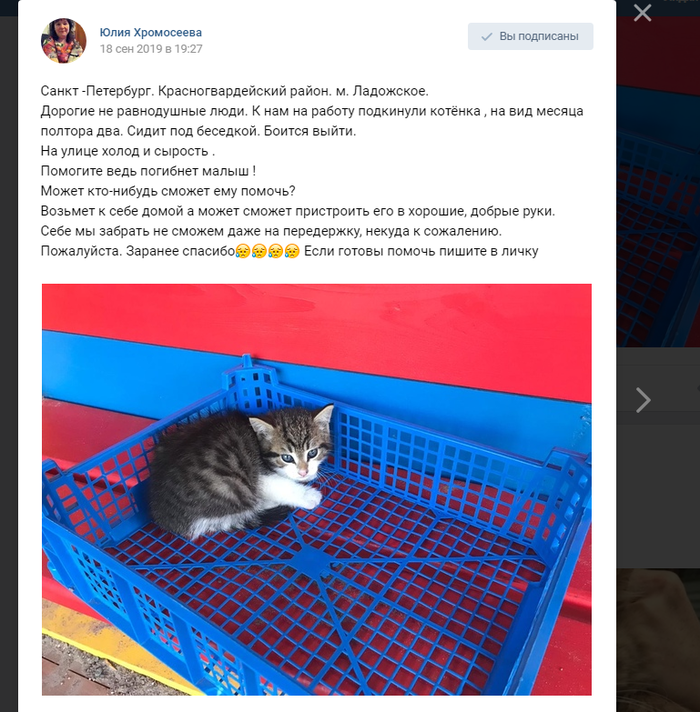 Оригинальный пост - https://vk.com/kolpino_cat?w=wall-120169022_12050 Там же - контакты для связи.