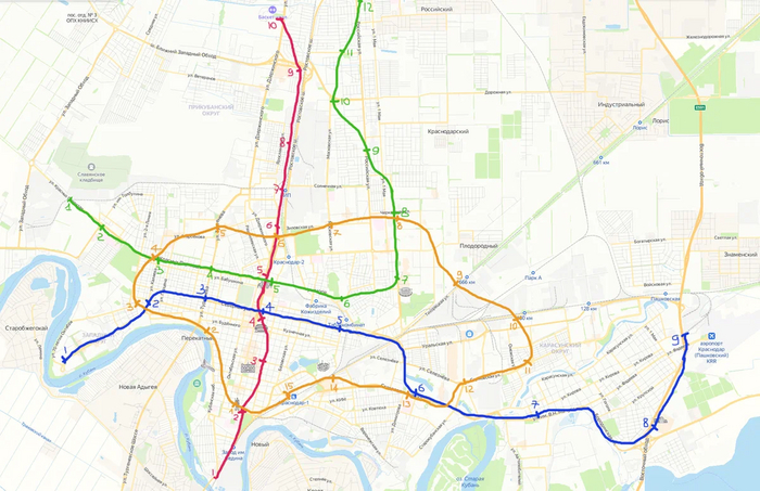 Аэроэкспресс (голубой) — 6 станций: 1-Краснодар-1, 2-Сортировачная, 3-Новороссийская, 4-Тюляевская, 5-Пашковская, 6-Аэропорт.