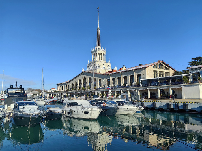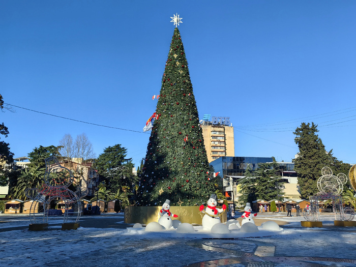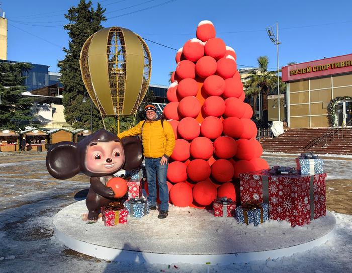 Сегодня со Светой просто гуляем по Сочи. Атрибуты новогоднего настроения окружают повсюду. Елочки с огоньками, мандарины с чебурашкой, и даже снегом город не обделила природа в эти дни. И, конечно, тут своя особенная стать, пальмы, море, солнце, красота.
