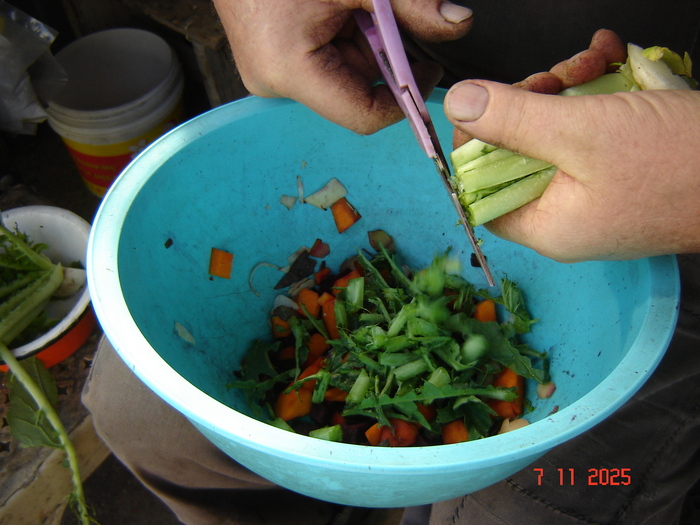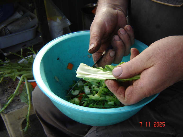 Все черенки капусты, свеклы и дайкона режем для измельчения.