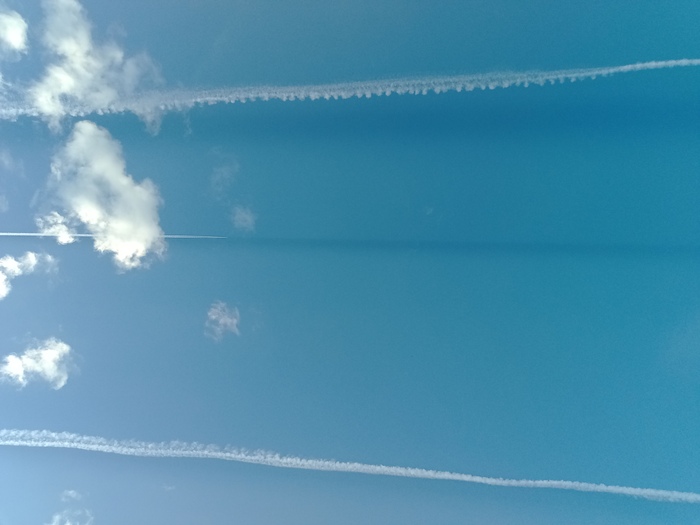 Как то летом, пару лет назад, я был в деревне и жарил шашлычки стоя у старого комбайна. Взглянул на небо, увидел и сфотографировал редкое явление - тень от летящего самолёта. Очевидно в небе помимо лёгкой облачности ещё и лёгкая дымка, плюс угол и направление освещения солнца как раз совпал с маршрутом полёта самолёта, причём не одного, а сразу трёх (очевидно над головой целая авиационная трасса).