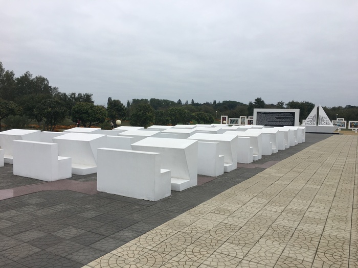 Первый – это созданный в 2007 году мемориальный комплекс «Детям – жертвам войны». Он открыт в память о детях, которых оккупанты собирали в Красном Береге со всей округи в 1944 году для последующей отправки в Германию остарбайтерами. Школьные парты на фото означают композицию «Мёртвый класс», за 21 белой партой никто никогда не будет сидеть и учиться.