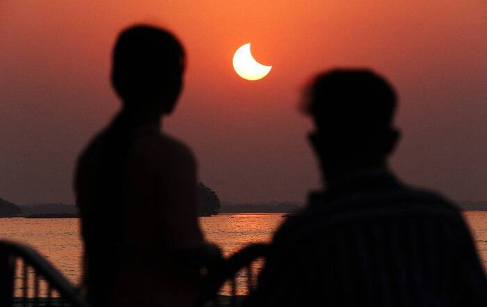 Составные фотографии, похожие на диаграммы, показывают ход солнечного затмения