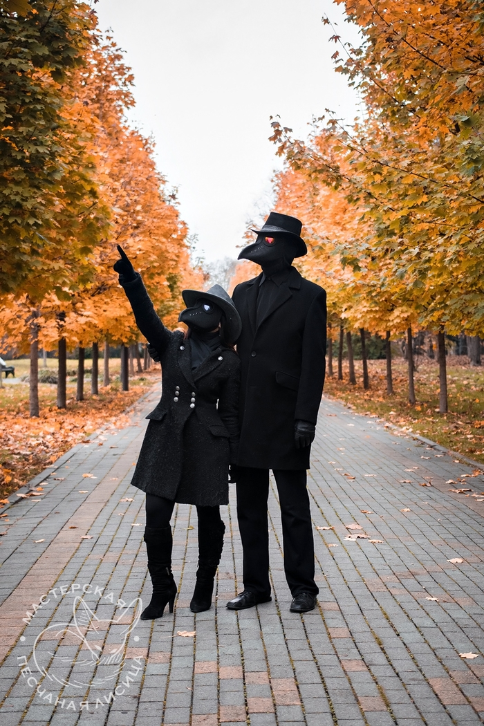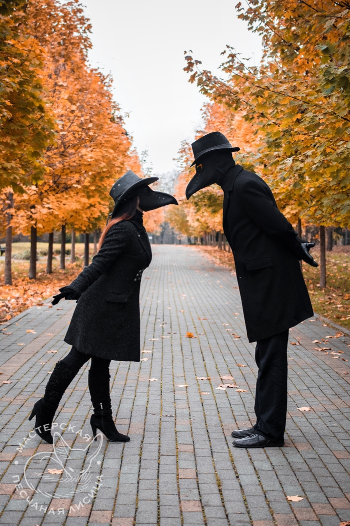 Новые работы: маски чумного доктора из кожи крс, фасон "классический". Ручная работа. Были выполнены на заказ - и возникла мысль отснять мини-фотосет с моделями. Маски разъехались к заказчикам, но осенний фотосет прогулок Чумных Докторов остался.