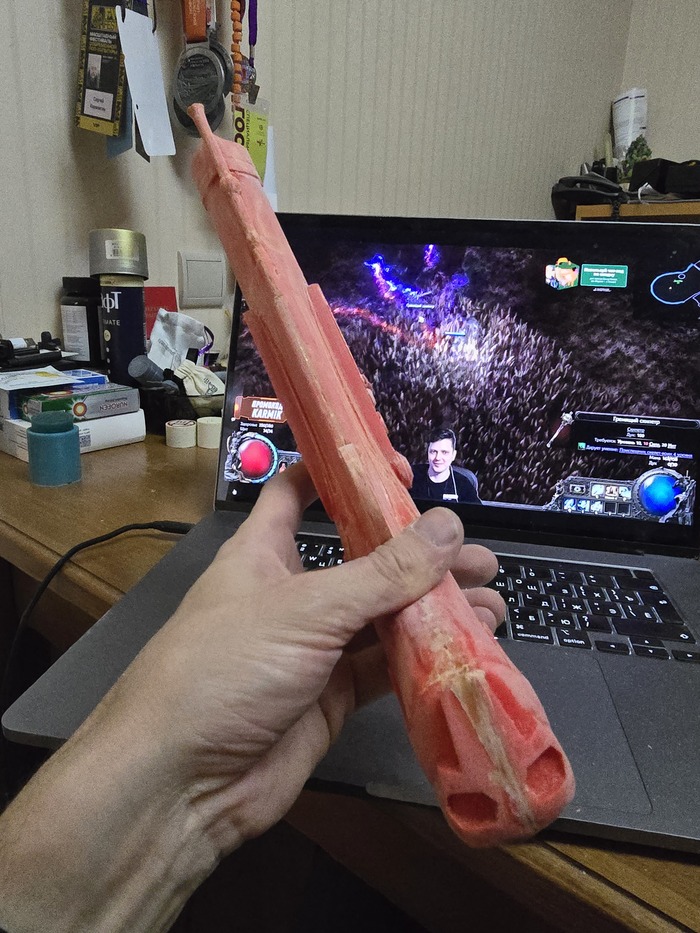 Беремся за модель под кодом С2. так как у меня логичная, но иногда странная система нумерации, то поясню, что первой былп совсем кривая модель А, в которой к моменту печати Компас-3D умудрился на пустом месте нафигачить ошибок с топологией в таком количестве, что оказалась непригодной к печати кроме как целиком, модель B, которая будет однажды доработана И вот собственно модели С. Но что могло бы пойти не так? а хрен его знает, модель С была хороша, но немного узковатой, а теперь уже модель С1.5, внезапно, будучи нарезана из одной модели, не то чтобы подходила всеми частями друг к другу... да и мысль о литье уже стала покидать мою светлую голову.... С плазмаганом такого небыло.... так как все модели пустотелые (с целью экономии фотополимера), то внутрь в 4 захода для каждой грани заливается эпоксидка - добавляет прочность, а также дает вес - но это уже опциональное - многие любят, когда обвес макисмально легкий, я же наоборот, не люблю "пушинки" и считаю, что вес добавляет натуральности общему виду. "Тяжесть — это хорошо. Тяжесть — это надежно. Даже если не выстрелит, таким всегда можно дать по голове." Борис Бритва