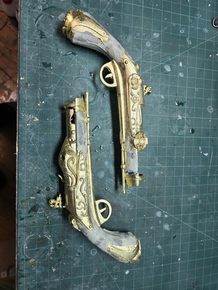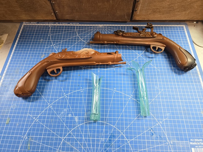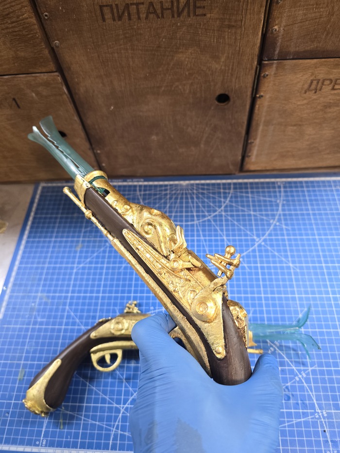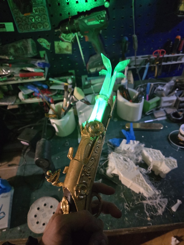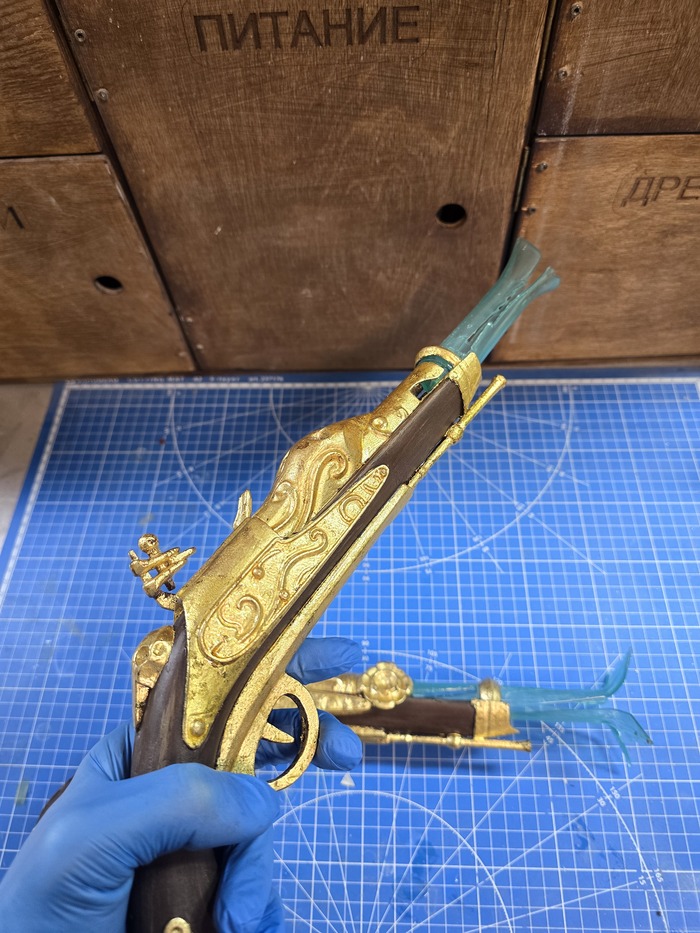 Основа АБС, стволы эпоксидка. Механизм парогенерации хотел делать сначала из электронок, но в итоге от них оставил только акк с зарядкой. А механизм сделал их шприца. Золото - поталь.