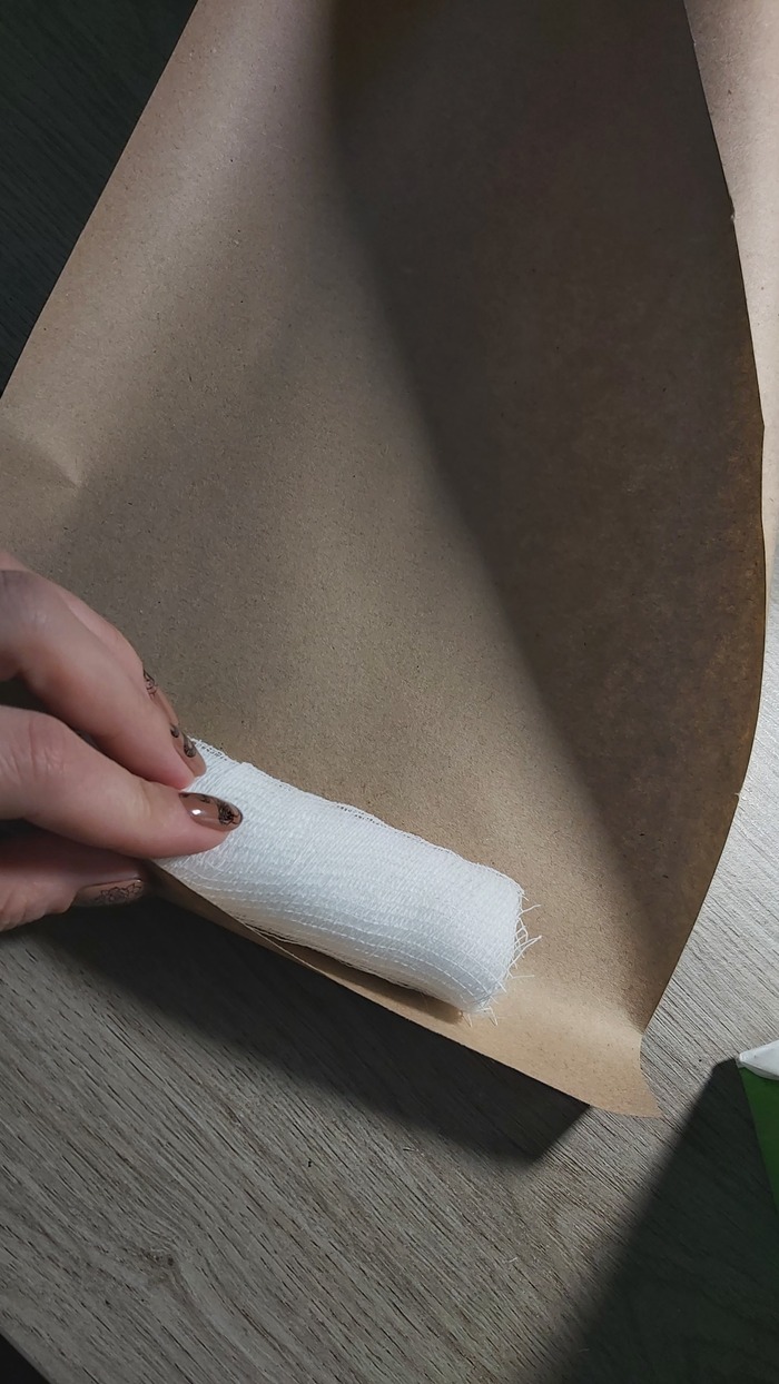 Чтобы примерить ширину полосы бумаги для упаковки бинта, достаю бинт из заводской упаковки и прикладываю к крафтовой бумаге. Я взяла запас справа и слева от бинта 3,5 см для заворачивания, но это чересчур много. Лучше брать 2-2,5 см максимум.