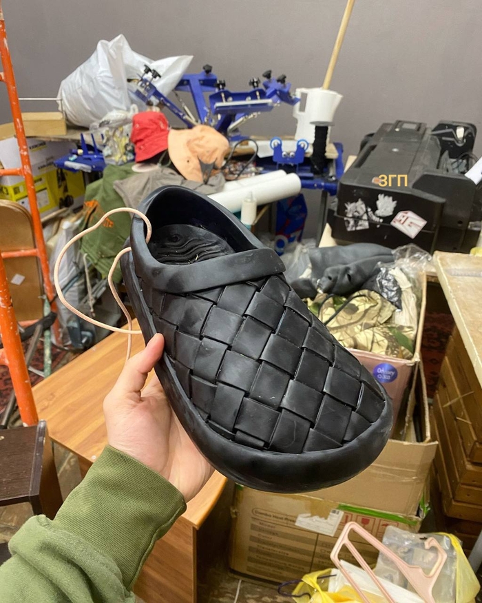 Бренд «Ништяк браток» создал максимально патриотичные лапти, в которых прямо хочется пойти в баньку или на пахоту. Сверху — плетение, символизирующее трудовые дни прошлого, внутри — орнамент стиральной доски, а подошва — аналог той самой легендарной стены ПО-2, которую мы все где-то видели.