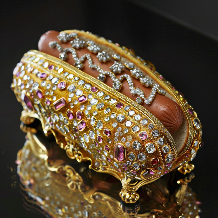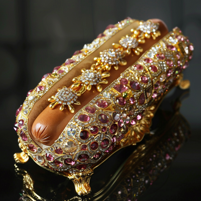 Именно эта история подтолкнула к мысли - а как бы мог выглядеть еще более дорогой хот-дог, самый дорогой в истории? Результаты совместного творчества с нейросетями вы видите