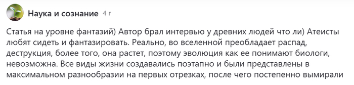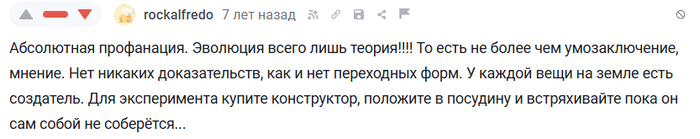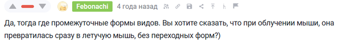 Вообще, такое чувство, что по мнению комментаторов учёные занимаются исключительно дискредитацией религий. Это не учёные даже, а атеисты мамкины. Наверно на кафедрах своих только и обсуждают, как бы ещё палок в колёса религии насовать. Ещё придумали биологию изучать, книжки читать. Зачем, у каждого же есть богатый жизненный опыт. Поэтому просто заходим на креационистский форум и копируем список "опровержений" ТЭ под мой пикабушный пост десятилетней давности, ну вообще кайф.