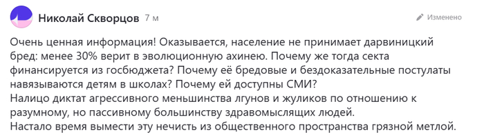 Дарагие вы наши… (в смысле – дорого обществу обходитесь) Теория – это не ваша догма, которую вы прибили гвоздями к мозгу. В результате споров ученых теории только выигрывают, отсеивается чепухня, они дополняются новыми фактами, если таковые есть, и их предсказательная сила увеличивается. Что интересно, любой поворот в дополнениях к теории - креацами и дебилами от религии – воспринимается как разногласия в рядах эволюционистов. Куриным мозгам не под силу представить, что можно идти по дороге с поворотами и ответвлениями. Догматичное мышление не способно представить что либо не похожее на узкий коридор, с глухими стенами. Отсюда и кричащие заголовки их тем «крах теории эволюции»… «ученые в шоке!» - всего лишь описание реальности при помощи мышления уровня ниже линолеума. Вот как пример, мы на работе по рабочим же вопросам - частенько ругаемся… Накал страстей близок к точке кипения, и тем не менее работа движется, в этих спорах находятся и принимаются лучшие варианты, но выглядит для ботаника так, что вот-вот щас друг не друга кинутся… И у него разрыв шаблона, когда звонок по телефону прерывает спор, и отвечающий поговорив, абсолютно нормальным голосом и тоном - приглашает оппонента на дачу с семьей. Тот приглашение принимает, выясняют, что с собой брать,(не в первый раз едут, дружбаны не разлей вода) и прочие мелкие детали, и снова начинают ругаться, (на счет - какие применить комплектующие применить и их компоновку) Ботан просто в шоке, ничего не понимает, для него тут сейчас идет война не на жизнь а на смерть, щас тут никого в живых не останется… Но понять он, ограниченный своим мирком, который считает единственным - так и не сможет, ему проще назвать непохожих на себя женоподобного нормальных мужиков, - дураками, а коллектив – склочным. Так и здесь… Любое непохожее на церковное следование догме – трактуется как разлад и конфронтация, что для него дурачка - является аргументом неправильности того, детали чего обсуждаются. В науке – примерно то же самое, споры могут быть страшенные, вплоть до «макнуть фейсом оппонента в салат на фуршетном столе, повозить по этому столу уже салатизированным лицом так, чтобы закуски в обшлага фрака набились… Все эти потуги креацев и религионеров мне напоминают высматривание и вынюхивание какого нить негатива(как ему кажется) в России свидомым украинцем, с последующим информационным высером типа «Крымский мост падает!». «России осталось два дня!», а примитивно берут из тупой башки, которая переполнена экскрементами. Мйдаунизм – это не эндемичное заболевание. В разных странах у разных пациентов – лишь разные обьекты для приложения их ненависти. А симптоматика-то - абсолютно одинаковая.