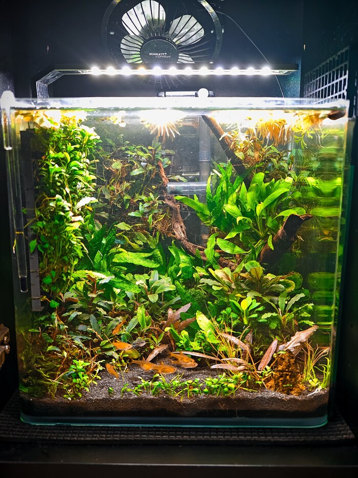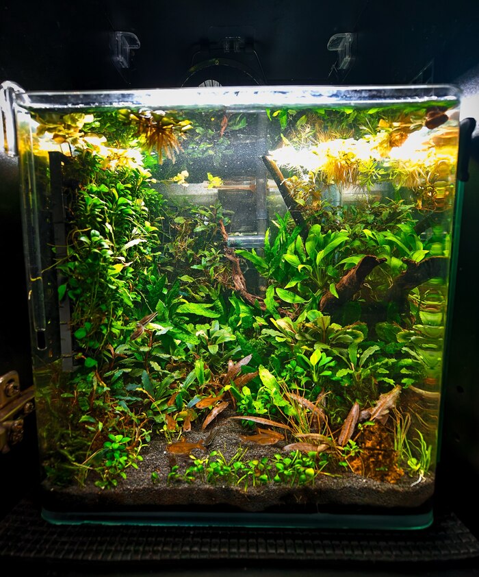 - В аквариум добавил корягу, которая раньше лежала без дела в тумбе.