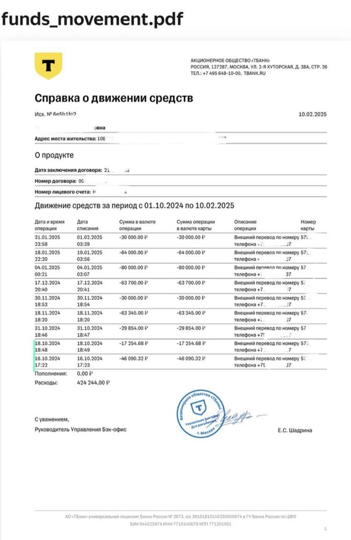 Год 2025. Меньше месяца назад у девы блокируют все карты и счета в банках. Она в афуе мечется просто везде и выясняет, что после установки ей приложения Сбера (в течении недели или около) кто-то судя по всему через приложение Сбера оформил на неё кредитку на 250 т.р., частями вывел или снял (я не понял и не уточнил, сорри) все деньги. Потом Сбер ждал до 2025 г., продал долг коллекторам, те пошли к нотариусу и оформили нотариальную запись, по которой пристав практически одномоментно заблочил ей все счета. И ещё она должна с набежавшими процентами около 300т.