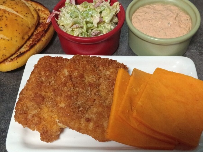 На нижнюю булочку выложите майонезный соус с красным перцем, верхнюю немного смажьте. На нижнюю булочку выложите жареную рыбу, 2 ломтика чеддера и салат "тартар". Накройте верхней булочкой.