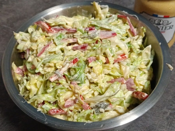 Нарежьте тонко капусту и положите в дуршлаг. Посыпьте солью и оставьте на 10 минут. Тщательно промойте холодной водой, слейте и отожмите центрифугой. Натрите лук и огурцы на терке, отожмите. Тонко нарежьте красный перец. Сложите в миску капусту, лук, огурцы, красный перец, рассол из огурцов, майонез, дижонскую горчицу, черный перец, кайенский перец и тщательно перемешайте. Уберите в холодильник на 30 минут. Перед сборкой откинуть на дуршлаг, чтобы слить лишнюю жидкость.