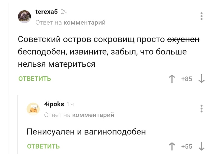 2374 TrufiKa Остров сокровищ великолепен или комментарии опять радуют 4 года назад Показать полностью 2 Комментарии Крепкое словцо Комментарии на Пикабу Скриншот Мат 14 1 Ещё 0