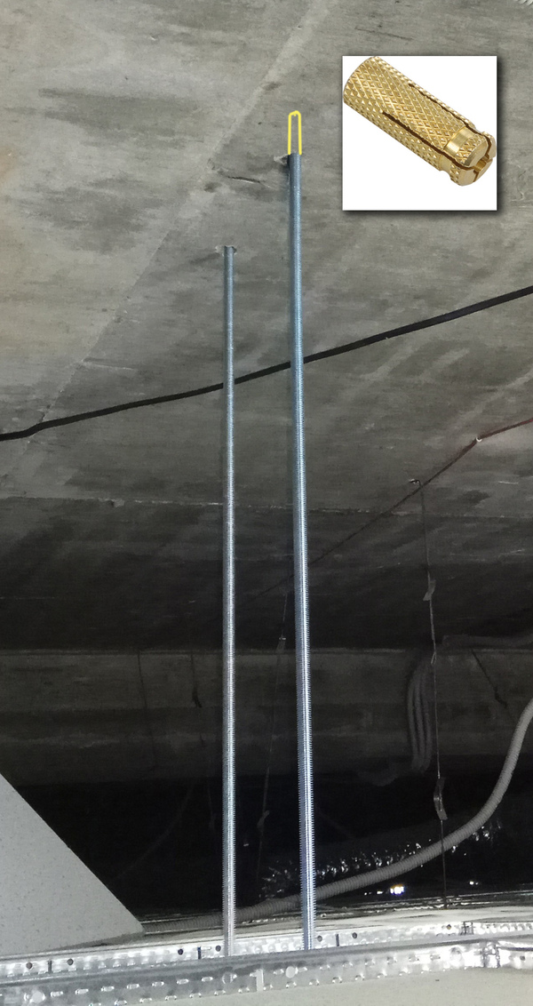 Шпильки я брал с диким запасом прочности, м10 или м12, уже не помню. Анкер именно такой, латунного цвета.