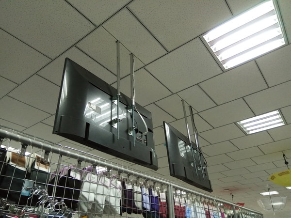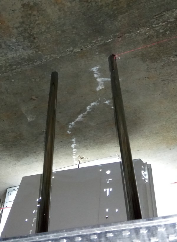 Для того что бы сделать наклон телевизора к зрителю, верхние уголки должны иметь большее расстояние на этом участке. Кстати весь ассортимент разных уголков уже давно продается в строительных магазинах. Так же труба которая закрывает шпильку продаётся либо в отделах занимающихся торговым оборудованием. Либо как в моём городе, в данном случае я купил всё в строительном магазине.