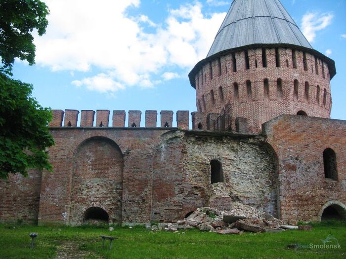 Смоленская крепостная стена – символ города, который многие ошибочно называют Кремлем. При возведении этой мощной крепости весь камень свозился в Смоленск, а по всей Руси запрещалось в это время строительство из камня. Когда-то мощное оборонительное сооружение опоясывало весь город. Но в результате частых войн уцелели только три километра крепостных стен и 17 из 38 башен. Смоленскую крепость воздвигли за семь лет. Зодчий Федор Конь потрудился на славу и создал по меркам того времени неприступное оборонительное сооружение. Кроме того, Смоленская крепость была еще и очень красива. Например, бойницы украшены наличниками по примеру окон жилых домов. По преданию, при строительстве в крепостную стену был вмурован череп боевого коня святого Меркурия, покровителя Смоленска, воина, спасшего город от татар в ХIII веке и павшего в жестокой сече. Своим ржанием легендарный конь всякий раз предупреждает смолян о надвигающейся опасности.