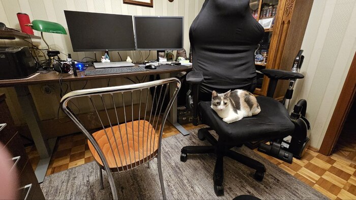 Пока ужинал... Вернулся к себе в комнату, тут мне и объяснили, чьи в лесу шишки. Пришлось тащить стул из кухни. Вообще-то, она редко пристраивается у меня в комнате. Но сегодня жена на сутках, дочь после всех этих праздников укатила к себе в столицу, так что вниманья мало-мальского пришли требовать к отцу родному. )))