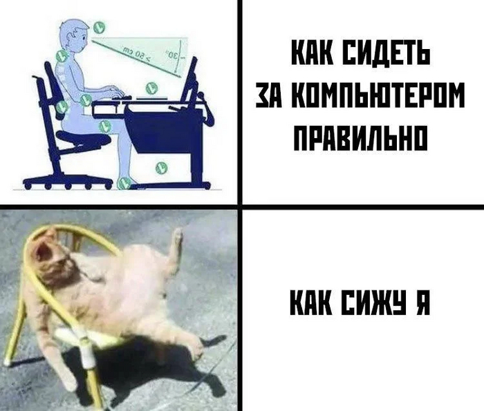 Теперь что касается посадки за столом. Эта тема всем известная, статей куча, описывать не буду. Общепринято, что должен быть упор для поясницы и в целом спина должна касаться спинки. Как по мне очень разумно, сам целыми днями сижу именно так (и иногда как кот). Спина чувствует себя отлично.