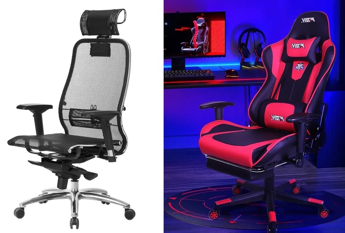 Слева современное офисное кресло, сам таким пользуюсь. Эргономичная спинка, поясничный упор с регулировками. Сетчатый материал, 100% вентилируемость. И так далее... Нормальное удобное кресло без компромиссов. Хотя упор для шеи используется чисто как реперная точка, что бы выпрямить спину и не сутулиться. Жизненной необходимости в нём нет.