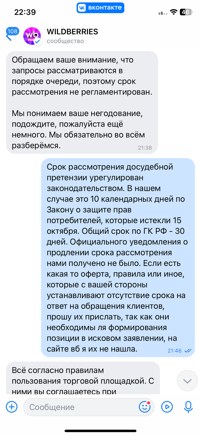 Ситуация следующая: заказали товар на WB, оплатили, доставка сразу была только курьерская на указанный адрес. Заказ конечно не на миллионы, но больше 20 тысяч, поэтому хотелось бы вернуть. В день доставки позвонил курьер WB и сказал, что доставить не может. Звонок проходил видимо с телефона самого WB, по крайней мере присутствовала маркировка звонка. В итоге курьер в последствии переносил доставку несколько раз и, 26.09 в очередной раз перенес, после чего в лк появилась от места, что заказ доставлен, хотя фактически заказ доставлен не был. Позвонили на горячую линию вайлдберис, пошли там в жопу сразу, написали в чат в приложении - аналогично. Вначале поддержка сказала, что заказ получен по какому-то адресу, который мы не указывали, потом «ждите, сроки ответа не регламентированы». Написали и отправили досудебную претензию, её зарегистрировали, в срок разумеется не ответили. Я написала везде где только можно, в их соц сетях (тоже послали), в поддержку писали каждый день, ну тут понятно, каждый раз унижения от посыла)) в полицию писать не стала, так как полагаю врятли это поможет и мне кажется тут все таки больше защита прав потребителя. Но я никогда не сталкивалась с таким чтоб курьер украл заказ, совершенно не представляю пока что писать в суд и как добиться хоть какого-то ответа от вайлдберис. Больше всего удивляет что курьер их, и полагаю им не доставило бы труда узнать где этот заказ. Прошу вас помочь мыслями и если возможно практикой таких случаев.