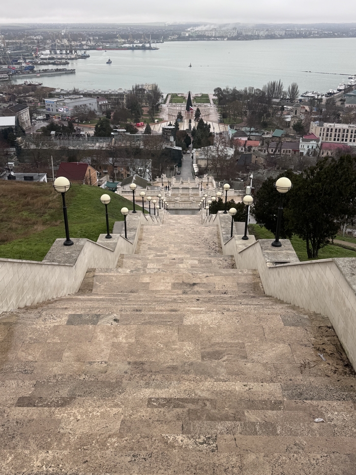 Поднялись по большой Митридатской лестнице на 424 ступени, а затем спустились на 423. Всё потому, что с правой стороны один из пролётов имеет больший перепад высот, и таким образом образовалась лишняя ступень.