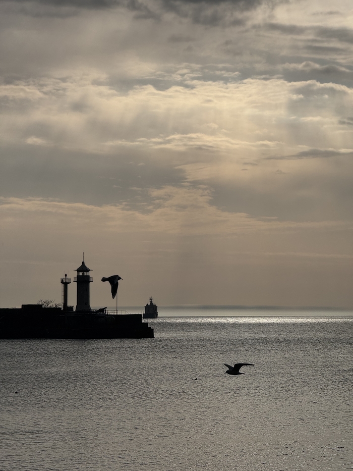 В итоге дорога от двери до двери с учётом заезда в Керчь заняла около шести с половиной часов. Вечером прогулялись по набережной. Народу было ровно столько же, сколько и в сезон, в июле-августе. И это несмотря на непрекращающийся дождь. Море тоже не очень курортного цвета.