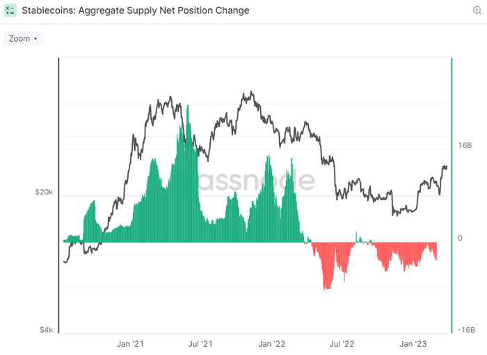 Во-первых, биржевая торговля не демонстрирует рост активности, что снижает спрос на стейблкоины. В ноябре рынок столкнулся с крахом FTX, а сейчас американские регуляторы всерьез взялись за Binance. По данным The Block, только за 27-28 марта с криптобиржи было выведено криптовалюты на $2,2 млрд. После фиксации части прибыли в марте пользователи вернулись к выводу Bitcoin с криптобирж на холодные кошельки.