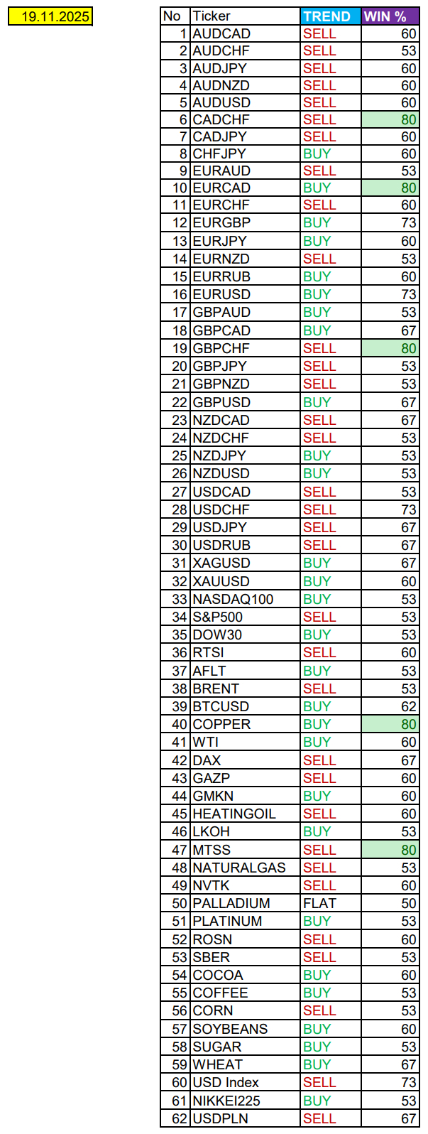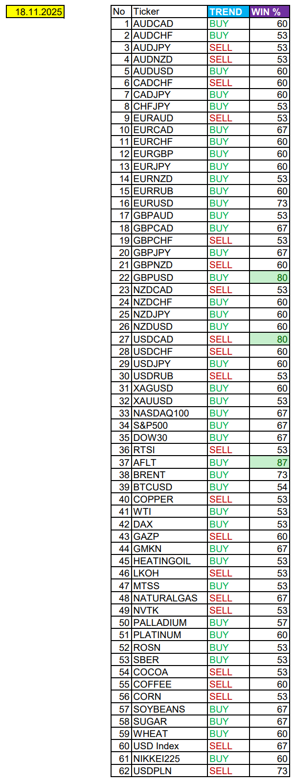 Сезонные тенденции и вероятности на среду 19.11.2025⁠⁠