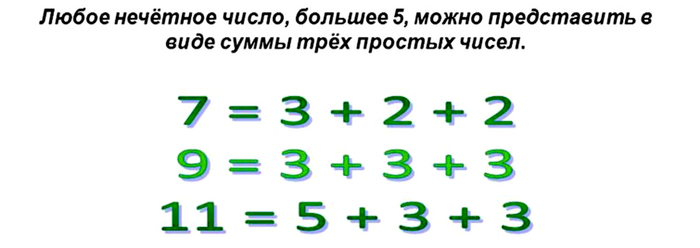 Вот именно – «и так далее». Можно заниматься подобными вычислениями годами, даже десятилетиями и убеждаться, что каждое новое нечётное положительное целое число, найденное вами, будет соответствовать гипотезе. Но!.. никто ещё не предложил убедительных доказательств того, что не существует нечётного положительного целого числа, которое не является суммой трёх простых чисел. Почему? Потому что нечётных чисел бесконечное множество и доказать верность гипотезы для каждого из них невозможно...