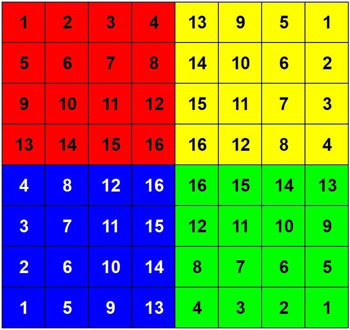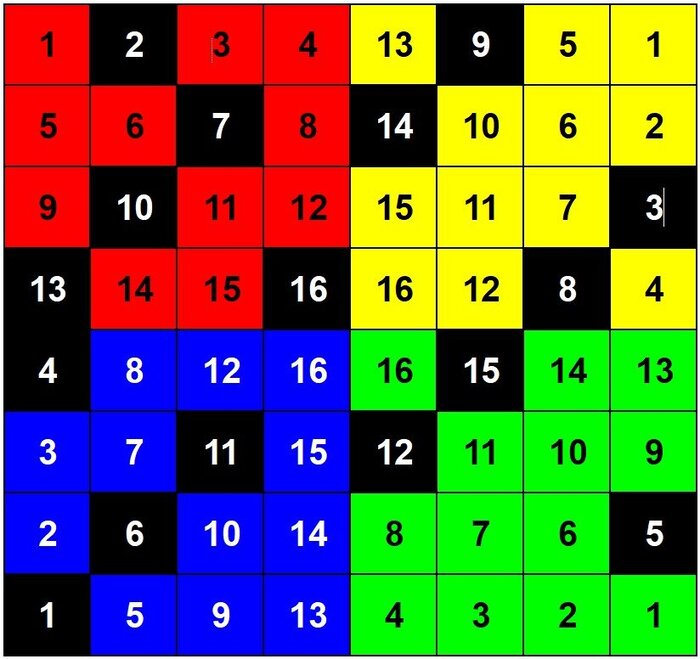 Цифры в каждой четверти «решётки» (мы для наглядности раскрасили четверти в разные цвета) идут от 1 до 16, причём сначала слева направо, затем сверху вниз и справа налево, затем снизу вверх и слева направо, и наконец справа налево и снизу вверх. Запутаться можно, но вы постарайтесь, и у вас всё получится. Вы можете использовать цветные фломастеры или карандаши для того, чтобы раскрасить доску или цифры, то есть правильно расставить цифры по квадратам доски.