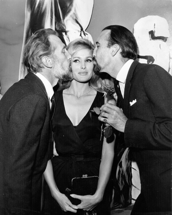 1965. Урсула Андресс с Кристофером Ли и Питером Кашингом на вечеринке в Лондоне. Все они звезды фильма «Она»: