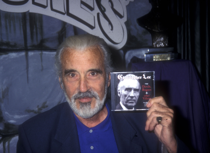1998. Кристофер Ли рекламирует свой новый компакт-диск «Дьяволы, разбойники и другие злодеи» на Creature Feature в Бербанке, Калифорния: