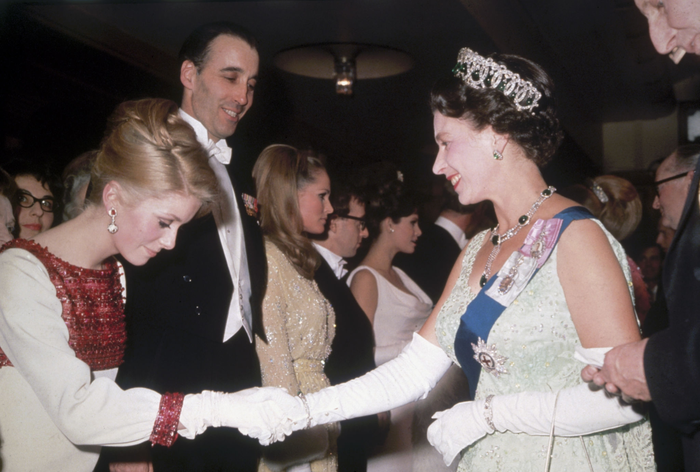 1966. Королева Елизавета II встречается с французской актрисой Катрин Денев. Также присутствуют (слева направо): Кристофер Ли, Урсула Андресс, Вуди Аллен и Ракель Уэлч. 14 марта: