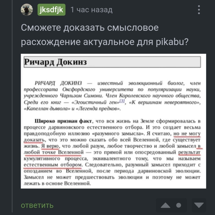 Риторические вопросы, которые ставит Докинз, указывают на ту же удивительную неусвояемость любых ответов, которые ему, несомненно, давали за прошедшие годы.