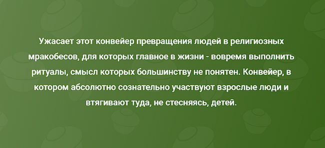 «Пришёл ребёнок. 15 лет. Принёс листовку от свидетелей Иеговы и говорит: «Не такие они уж и плохие. Они там песни поют, говорят, что друг другу помогать надо». Я взяла почитать и не увидела там никакой крамолы».
