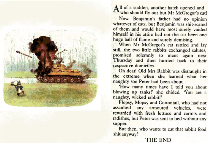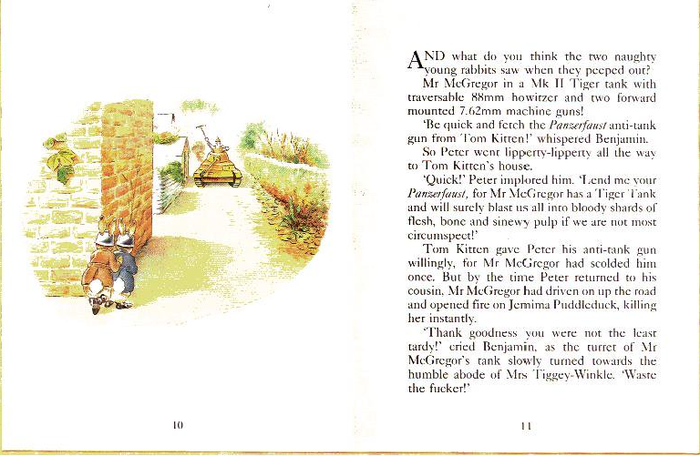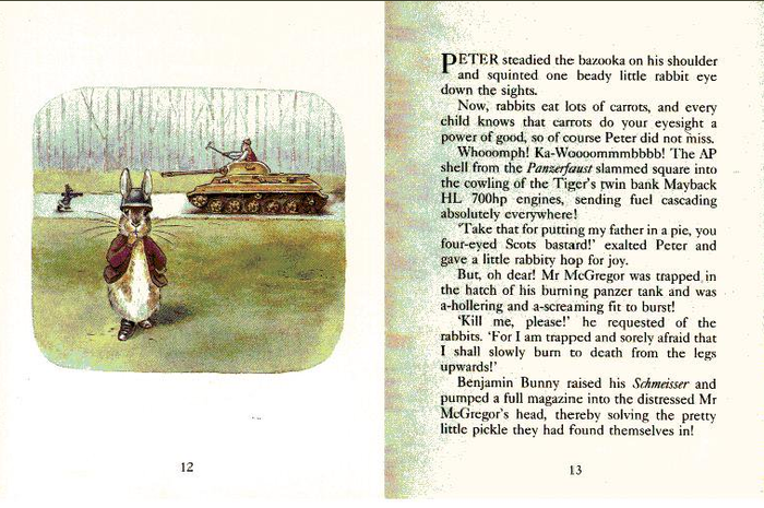 С мультфильмом всё ясно. Расстрелять и создателей и прокатчиков! А вот по поводу сказок Беатрис Поттер… Это классические сказки для детей того времени. И ещё - они классическими являются, в моём понимании, потому что в них нет агрессии, грязи (даже намёка на грязь), и прочих прибамбасов, которые есть в сказках вырожденцев.