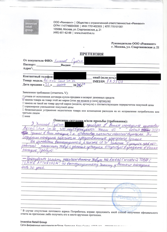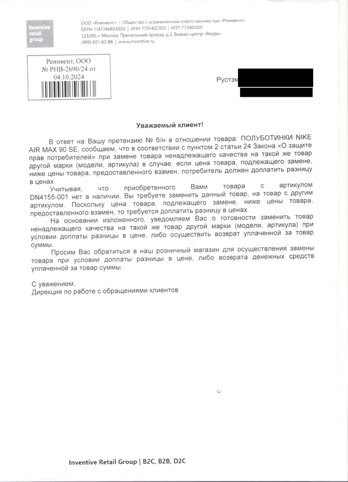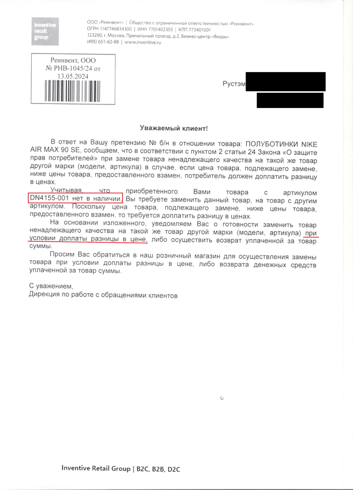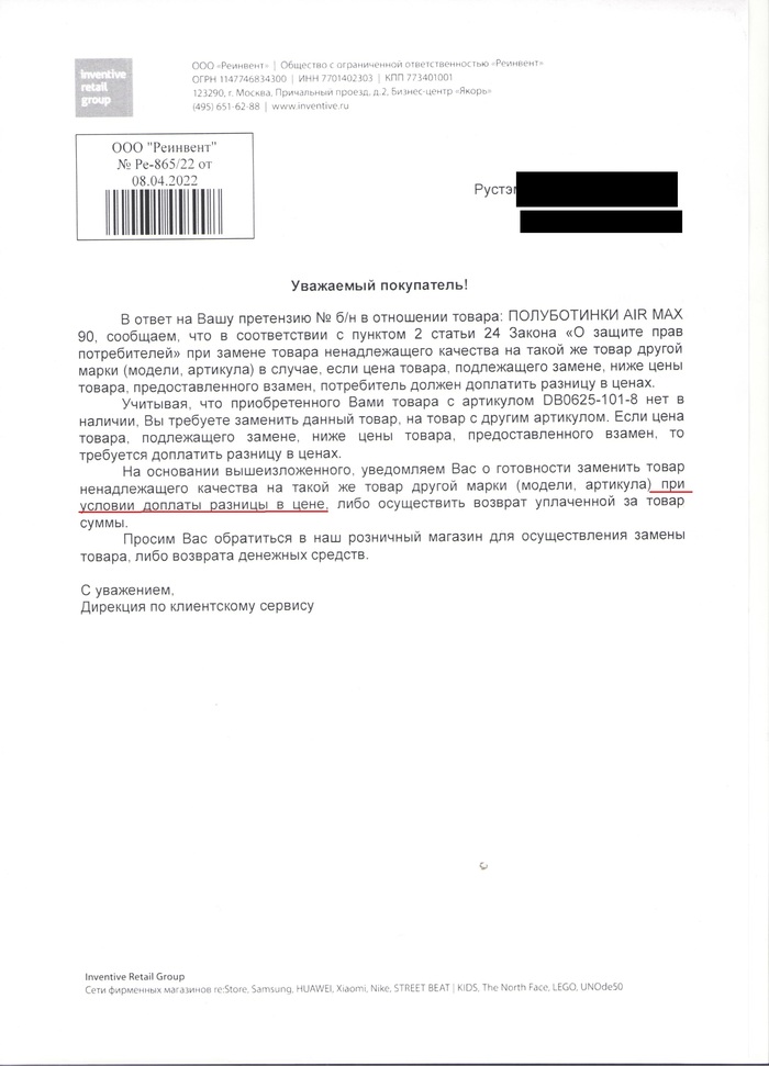 Третья попытка — Adidas Stan Smith. Снова порвались. Юристы также отреагировали отпиской, еще и с забавной опечаткой: в названии - Adidas Stan Smith, в артикуле - Nike Air Max 90 SE. Они просто взяли отписку по другой претензии и не удосужились ее проверить!