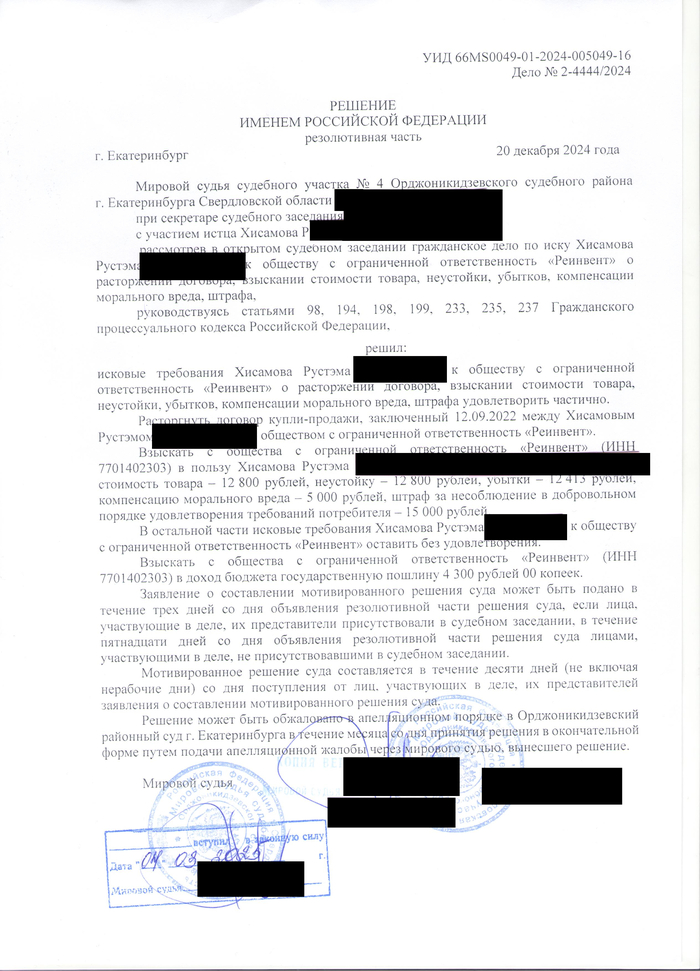 Суд не оценил их фантазию и в четвёртый раз поставил точку в этом цирке, обязав Реинвент выплатить мне 58 000 рублей.