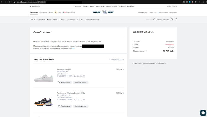 Мне стало интересно, как работает их интернет-магазин, и я заказал две пары кроссовок. Доставка была назначена на 16 ноября с 10:00 до 14:00… но Street Beat не был бы Street Beat, если бы не напортачил! Заказ приехал только 17-го, а одна пара оказалась витринным образцом. Узнал я об этом только после общения с поддержкой, которая вместо извинений предложила щедрую компенсацию – 10% скидку на следующую покупку.