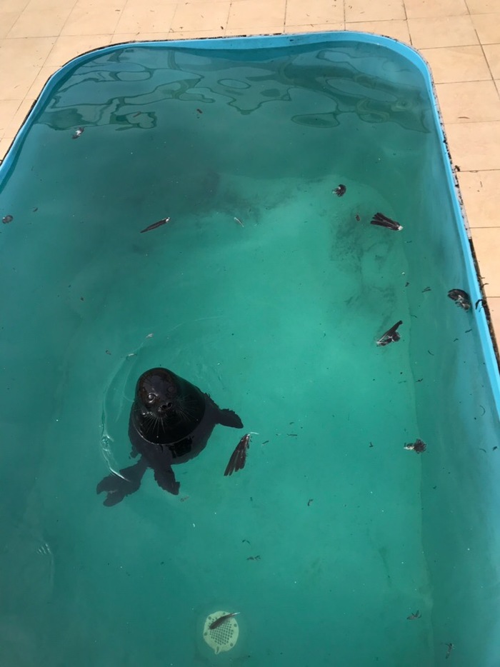 Сотрудникам "Фонда друзей балтийской нерпы" приходится систематически чистить воду в бассейне ластоногого от перьев и следов борьбы.
