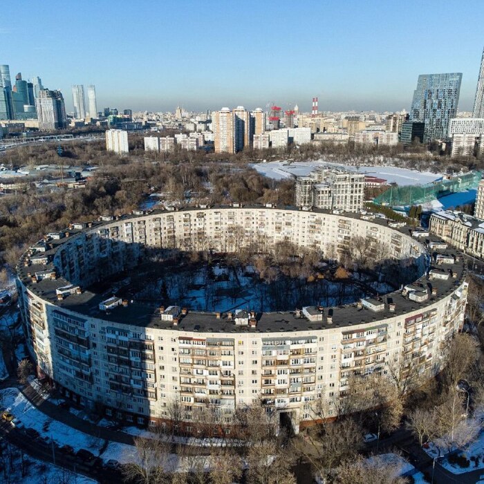 Круглый дом на улице Довженко в Москве 1979 года постройки. Высота - 9 этажей, длина - 26 подъездов, жилье рассчитано на 936 квартир. Всего в городе два круглых дома, второй находится на Нежинской улице.