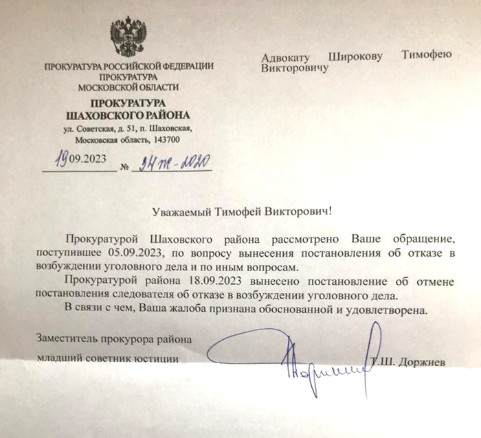 Ниже копии постановления Шаховского районного прокурора Т.Ш.Доржиева и письма, в которых действия Шаховского СО ОМВД признаются незаконными, письмо заместителя Министра внутренних дел РФ М.Г. Ваничкина