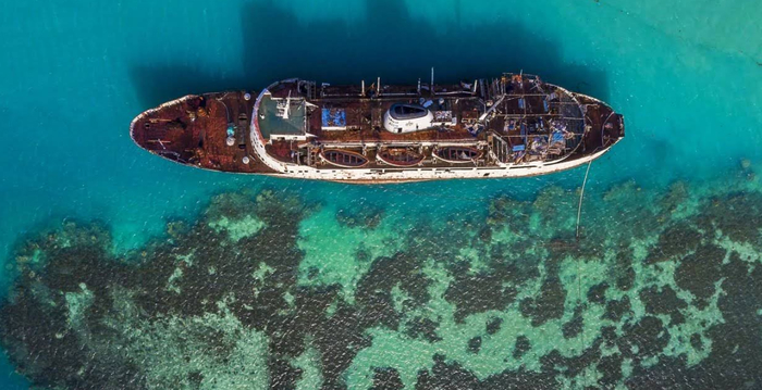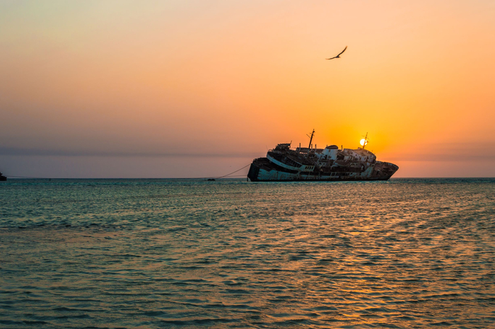 Ладно, на самом деле корабль бросили здесь в 2004 году из-за проблем с двигателем. Теперь он привлекает местных и туристов и особенно красиво смотрится на закате: