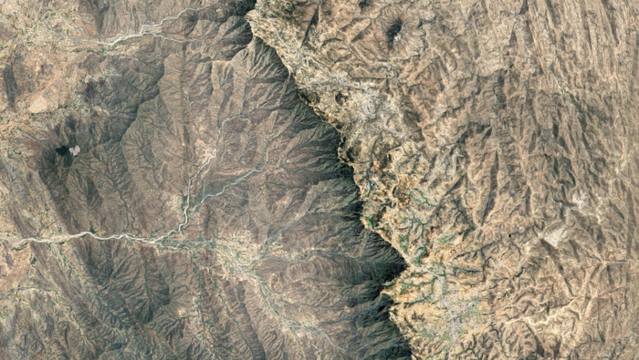 Узкое ущелье, выходящее к бескрайней пустыне на востоке. На юге за горами начинается Йемен. Граница здесь очень условная - Наджран вообще-то принадлежал Йемену, а в состав Саудовской Аравии вошел на правах автономии. Правда, со временем эти права отобрали силой, поэтому чуть что - сразу напряжение в регионе усиливается.