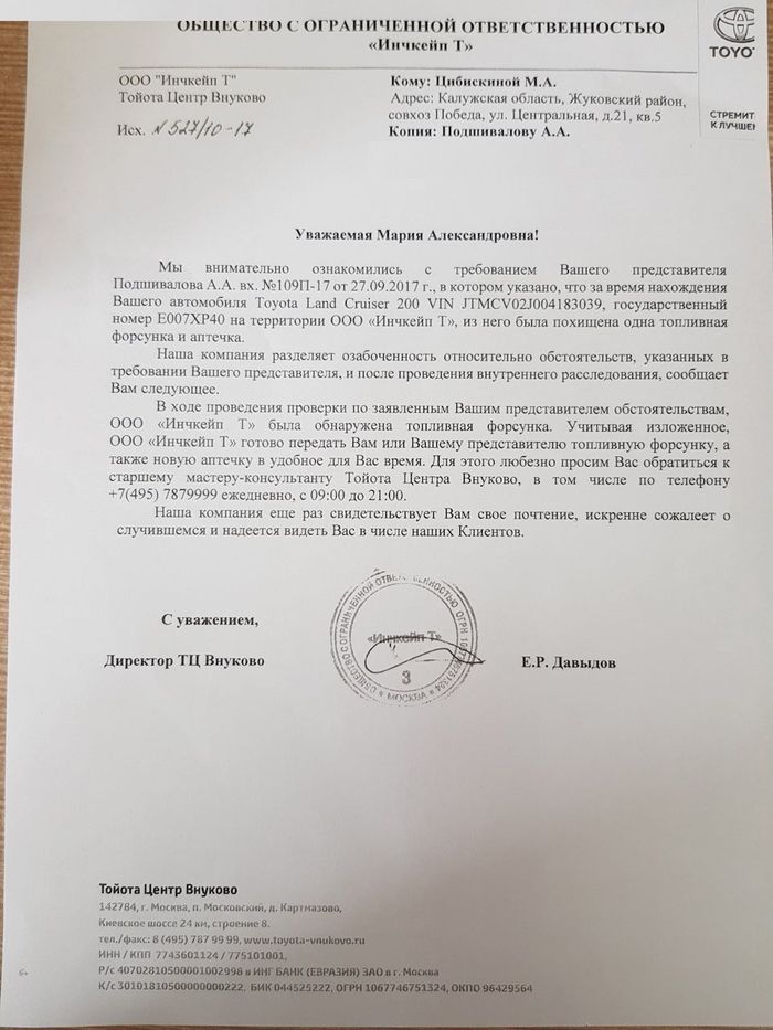Между первой и второй судебными экспертизами произошло интересное событие. Крузак стоит у дилера Тойота Внуково. При первой экспертизе эксперт снял с двигателя четыре топливные форсунки и положил в багажник Крузака. А когда проводилась вторая судебная экспертиза, оказалось, что одна из форсунок пропала! Её просто украли из багажника! Потом Тойота Внуково написала моему юристу письмо, что форсунка нашлась. Но когда мы с юристом приехали её забирать, оказалось, что форсунка подвергалась ремонту! И вообще непонятно, та ли это форсунка или другая. Мне кажется, что другая. Где она нашлась и почему пропала из маишны, Тойота Внуково ответить не смогли.