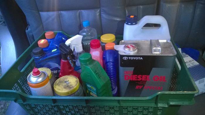 Жидкостей мне досталось немало: тут и оригинальное тойотовское масло, и тосол, и трансмиссионка… Короче, необходимый минимальный запас жидкостей у меня теперь точно имеется. Упаковал его временно в один ящик. Надо подумать, как предотвратить разлёт этих канистр по всему багажнику на первом же лежаке.