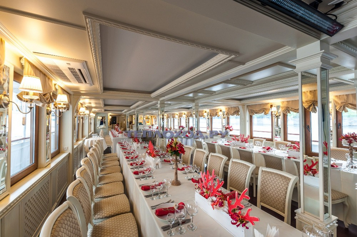 Поесть можно в роскошном ресторане в прованском стиле. Также на борту расположены 3 бара, кофейня, конференц-зал, медпункт и массажный салон. А открытая палуба отлично подходит для прогулок и принятия солнечных ванн.
